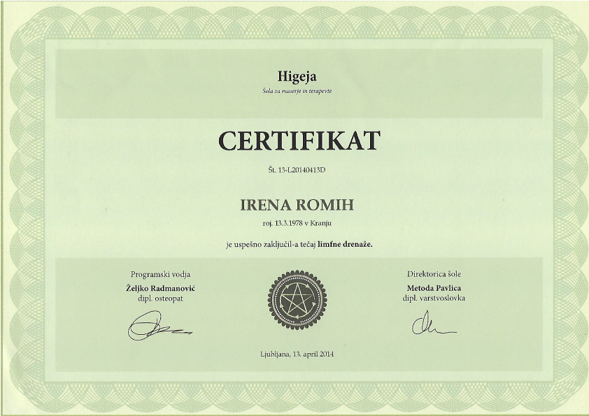 O meni - Irena Romih Leta 2021 sem pridobila rusko licenco za pregled parazitov v krvi; pregled žive krvikonec leta 2019 sem zaključila 3-letno naturopatsko izobraževanje v naturopatski šoli Saeka, ki jo vodi ga. Erika Brajnikcertifikat nacionalna poklicna kvalifikacija refleksoterapevtka (april 2014)certifikat ročne limfne drenaže (april 2014)profesionalni tečaj refleksoterapije (2013) na Higeji – šoli za maserje in terapevte Terapevt je dober le toliko, kolikor hkrati dela tudi na sebi, kar pomeni, da se že odpirajo nova obzorja izobraževanj.